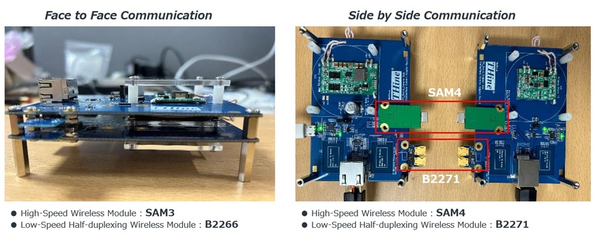 「SAM3」以面对面的方式进行无线传输,如图4左侧所示。也就是说传送板和接收板叠在一起,数据在2个SAM3之间发送。此外,韩国SENSORVIEW也准备了并排进行无线传输的毫米波通信模组--「SAM4」。通过使用此功能,使用者可以将传送板和接收板并排放置,并在2个SAM4之间发送数据(图4右)。这两款模组均采用STMicroelectronics的ST60A2作为毫米波通信晶片,并结合SENSORVIEW自主开发的小型贴片天线。