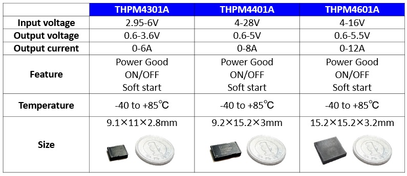 这次我们准备了最大输出电流不同的3款产品(表1)。6A输出产品「THPM4301A」、8A输出产品「THPM4401A」与12A输出产品「THPM4601A」。6A输出产品的输入电压范围在2.95~6V。设想输入电源为5V的Bus中央电压。8A输出产品的输入电压范围在4~28V。12A输出产品在4~16V。这两款的设想输入电源均为12VBus中央电压。外形尺寸上6A输出产品为9.1mm×11mm×2.8mm、8A输出产品为9.2mm×15.2mm×3mm、12A输出产品为15.2mm×15.2mm×3.2mm,每一种都很小。转换频率上6A输出产品与8A输出产品大约为750kHz、12A输出产品约为1MHz。